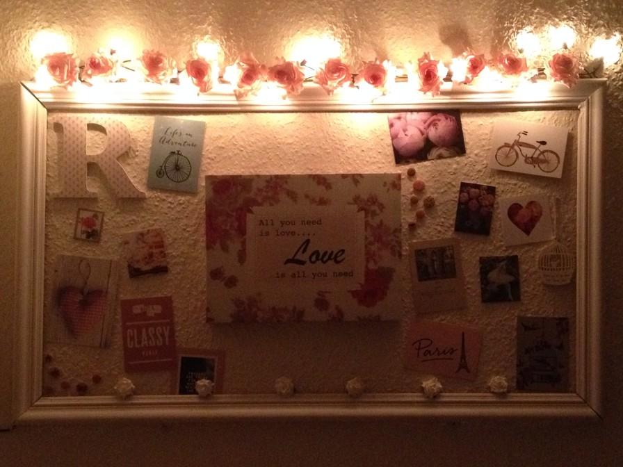 The frame above my bed I add pictures and cards to each week. I have added fairy lights to the top, which has made the room a lot cosier.